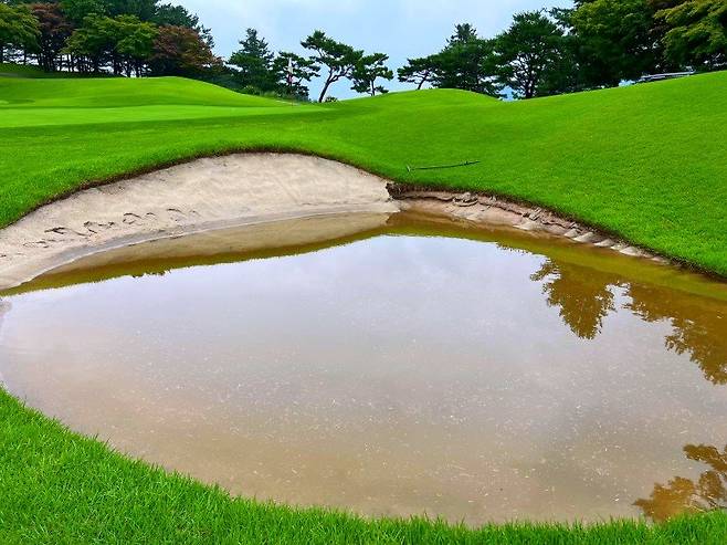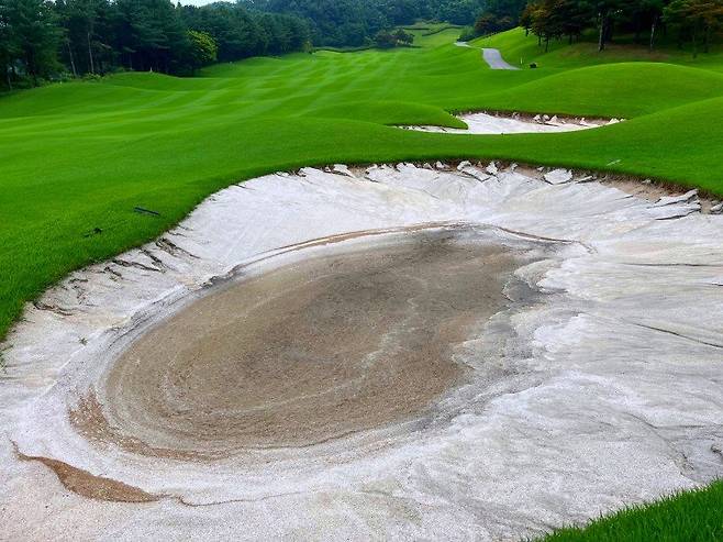 여타 골프장에 비해 적은 개수인 41개(Out 19개, In 22개)의 벙커를 가지고 있고 주로 그린 사이드에 위치해 있습니다. 전날과 전전날 비가 많이 내리긴 했으나 배수가 안되는 벙커는 아시아나 명성을 생각하면 아쉬움이 가장 큰 사항이었습니다. 거의 모든 벙커들에 물이 차있어서 벙커 관리 상태나 모래의 양을 확인할 수 없었습니다. 벙커의 모래는 주문진규사를 사용한다고 알려져 있는데 이날 벙커는 플레이는 커넝 벙커에 공이 빠졌을 경우 볼을 꺼낼 수 없이 버리고 와야 하는 수준이어서 아쉬웠습니다.