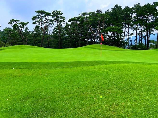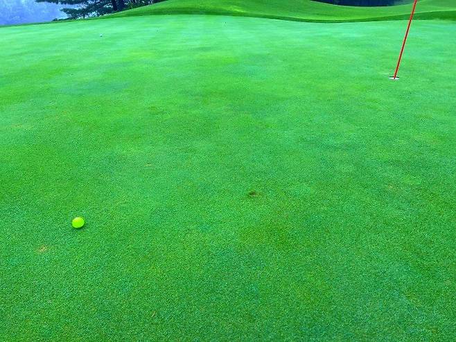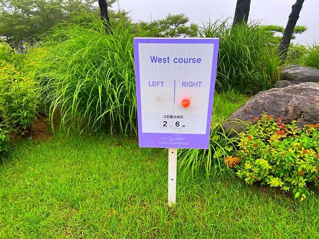 별도의 공지대로 이날 그린 스피드는 2.6m 정도의 보통 빠르기 정도였습니다. 그린에 그늘진 부분이 없어 모든 홀에서 비슷한 스피드를 보였고 비가 내림에도 불구하고 2.6m 그린 빠르기라면 그린 상태로 봤을 때 3.0m 이상의 그린 스피드를 만들 수 있는 골프장이었습니다.