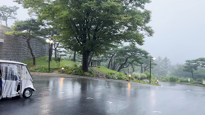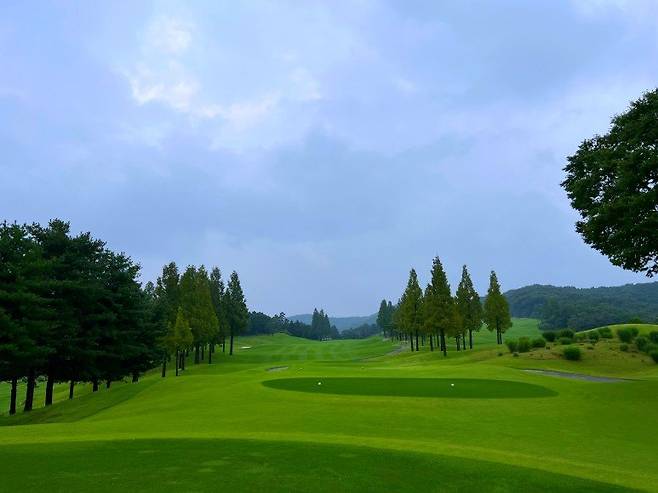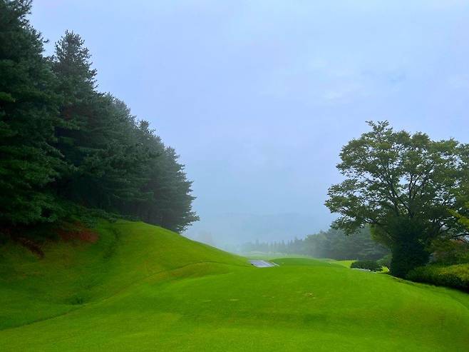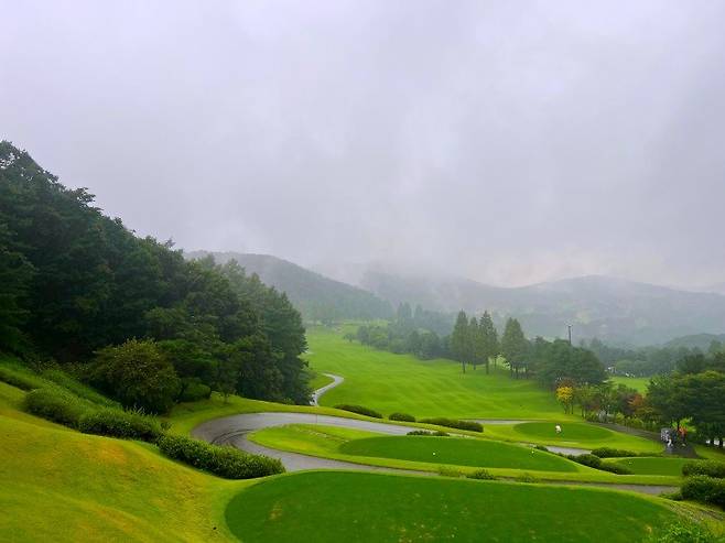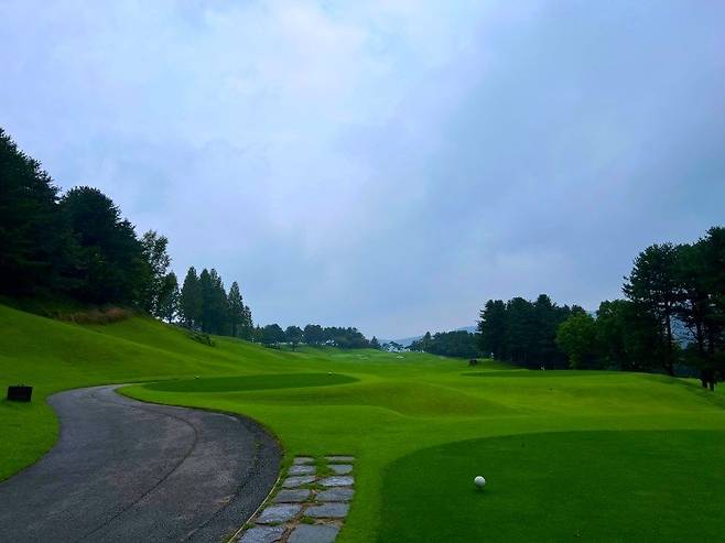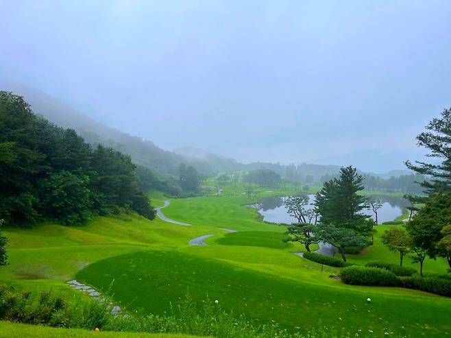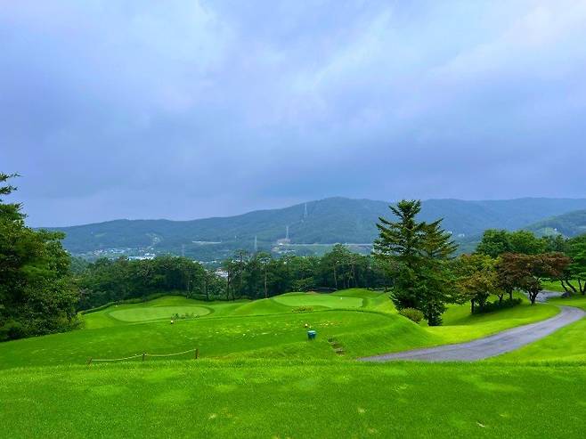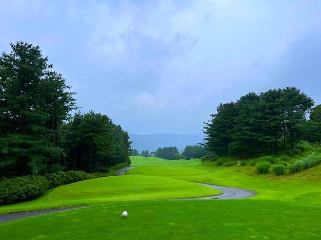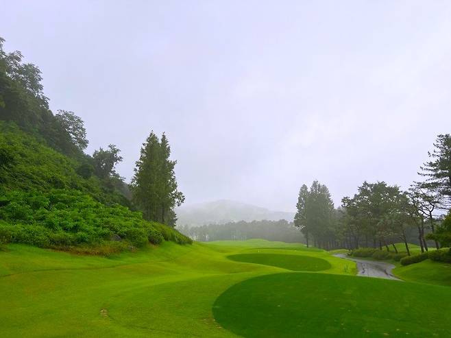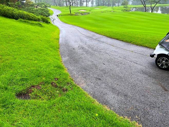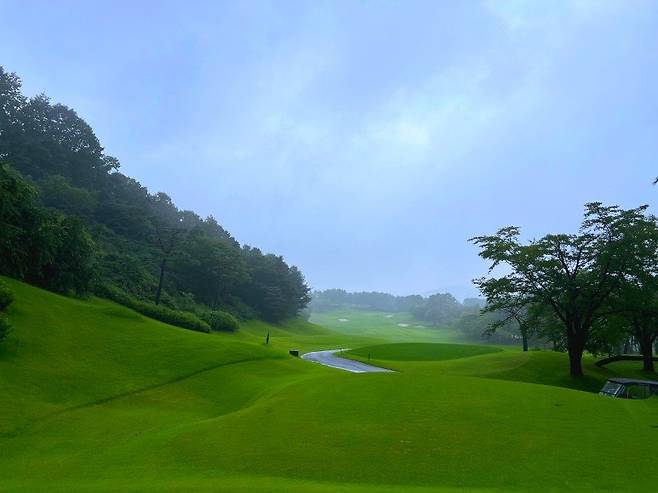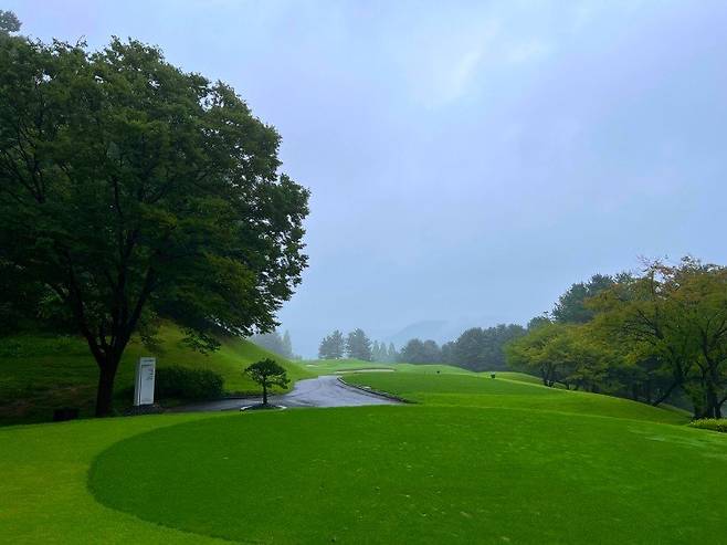 전날에 이어 이날도 비가 내렸는데, 다행히 저희 팀 라운딩 중에는 미스트 정도의 비가 내려 18홀 내내 경기를 할 수 있었습니다. 카트 대기장소는 조금 협소한 편인데 내려가서 좌측은 서코스, 우측은 동코스로 연습 그린도 별도로 준비되어 있습니다.