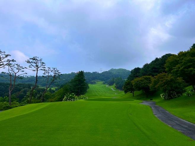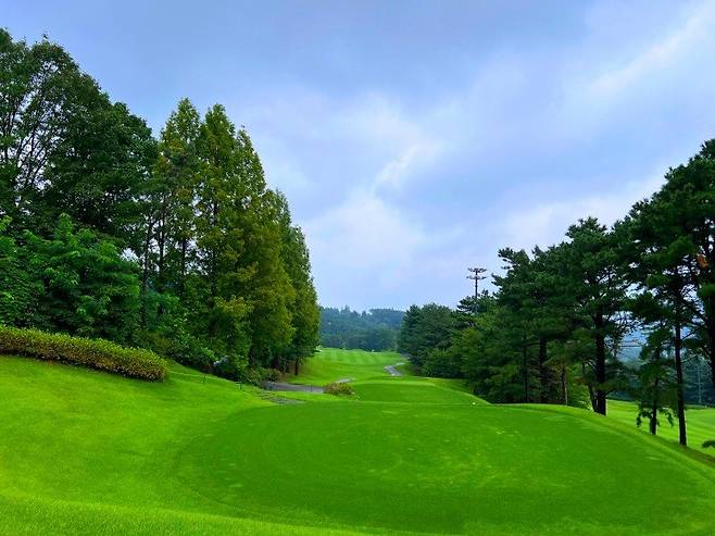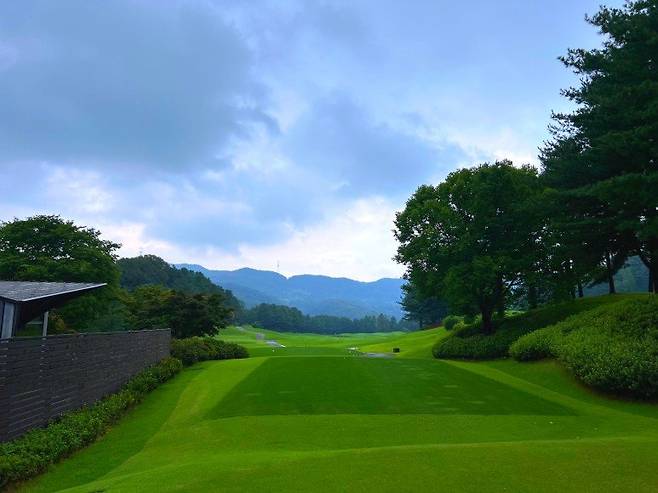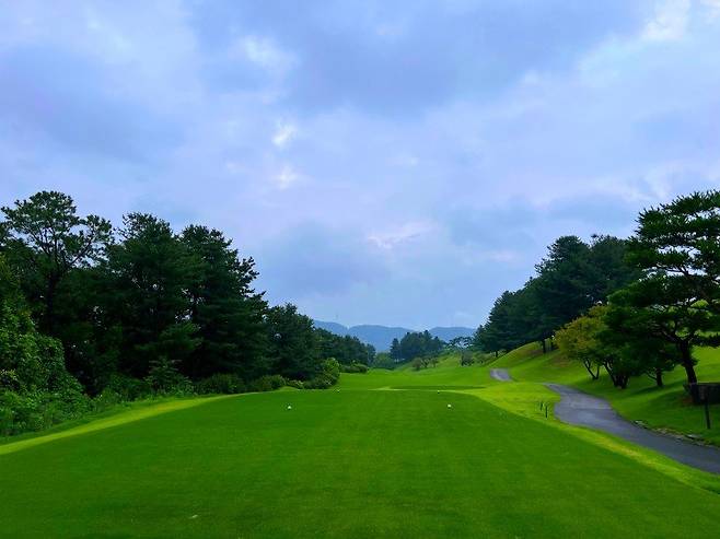 후반 첫홀은 350m 좌측 OB 구역으로 미들홀입니다. 코스가 한눈에 내려다보이는 완만한 내리막 형태로 페어웨이가 넓어 부담이 없는 홀이기도 합니다.