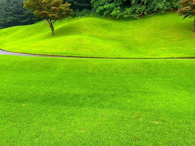 러프는 페어웨이와 마찬가지로 조선 잔디로 되어있습니다. 알려져 있기로는 조선 잔디 중 야지로 되어있다했는데 이날 방문했을 때 저는 야지보다는 중지로 느껴졌습니다. 페어웨이보다 러프는 조금 긴 편이었는데 A 러프의 길이가 30mm 정도, B 러프는 40-50mm 정도로 생각하시면 될 것 같습니다. 저는 개인적으로 위 사진처럼 페어웨이와 A 러프, B 러프 경계가 명확한 걸 좋아하는 편인데 관리도 잘 되어있는 편이라 잔디관리에 대한 이슈는 없는 구장 같습니다.