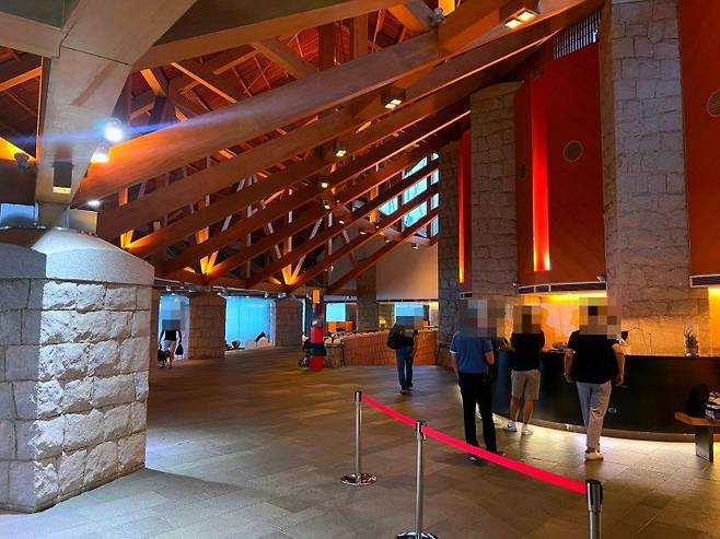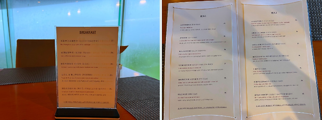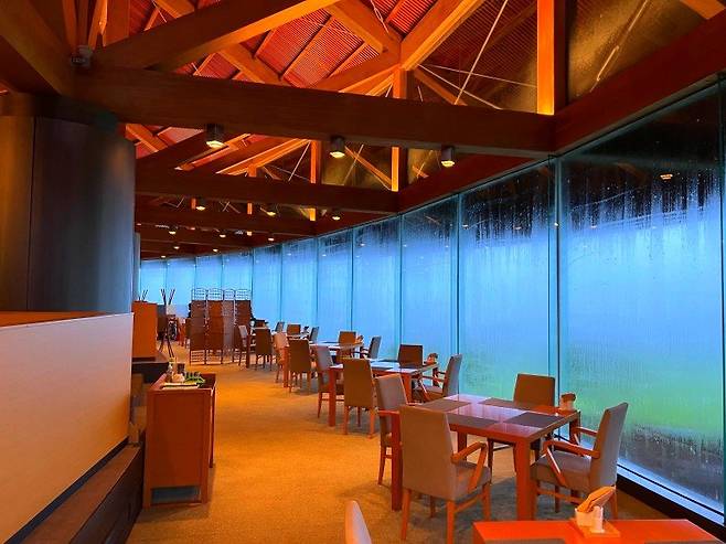 앞서 말씀드렸다시피 대식당은 리셉션과 같은 1층에 준비되어 있고 270도 각도의 창은 각 테이블마다 코스를 바라볼 수 있게 해두었습니다. 이날 비가 내려 바깥 풍경은 보지 못했는데 날이 좋은 날 코스를 바라보며 앉아있으면 푸른 잔디 위에 떠있는 느낌이 든다고 하여 많은 분들이 좋아합니다.