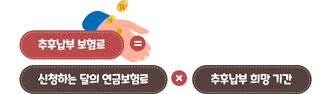 추후납부 보험료는 추후납부를 신청한 달이 속하는 달의 연금보험료에 추후납부를 희망하는 기간의 월수를 곱해서 산출합니다.