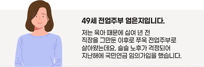 그래서, 지난해에 국민연금 임의가입을 했습니다. 지금은 남편 월급으로 생활하고 있지만, 노후에는 내 이름으로 된 소득을 갖고 싶었거든요. 하지만 60세까지 보험료를 낸다고 해도 손에 쥘 수 있는 연금이 많지는 않더라구요.