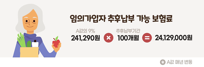 이 경우 임의가입자가 납부하고 있는 연금보험료는 ‘A값의 9%’(241,290원)보다 많습니다. 따라서 임의가입자는 추납보험료로 241,290원에 100개월을 곱한 24,129,000원를 납부하게 됩니다.