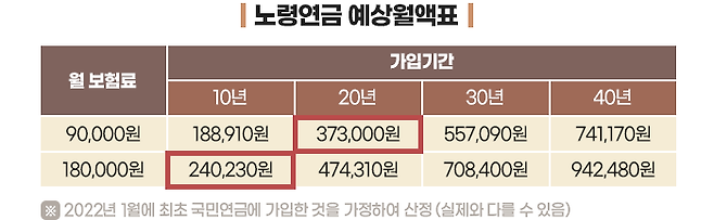 아래 표는 2022년 1월에 국민연금에 가입한 사람의 보험료와 가입기간에 따라 받는 노령연금월액을 나타낸 것입니다. 매달 9만 원씩 20년 동안 보험료를 낸 사람은 노령연금으로 매달 373,000원을 받지만, 18만 원씩 10년간 보험료를 납부한 사람은 매달 240,230원을 연금으로 수령하게 됩니다.