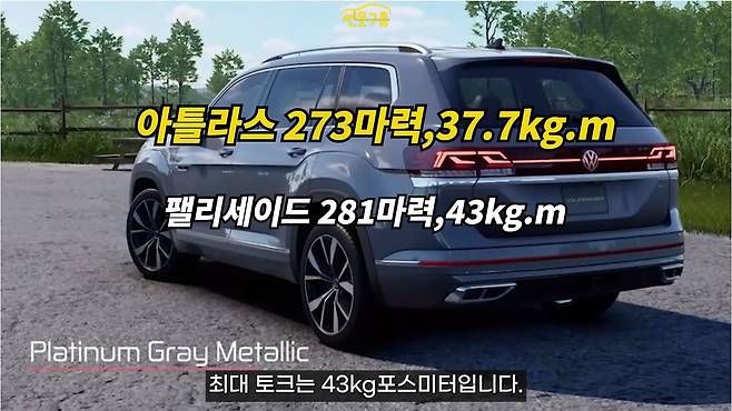 아틀라스의 파워트레인 스펙은 273마력에 최대 토크 37.7kgf·m입니다. 팰리세이드의 경우 2.5 엔진으로, 최고 출력 281마력, 최대 토크 43kgf·m인데요. 스펙상으로는 팰리세이드가 우위에 있고, 최고 출력은 약 8마력 차이, 최대 토크는 약 5.3kgf·m 차이가 납니다.