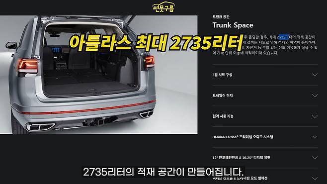 이건 1.5리터 음료수 180개를 더 수납할 수 있는 정도의 큰 차이라고 해요. 그래서 트렁크 적재 공간을 포함한 실내 공간은 아틀라스가 좀 더 크다고 할 수 있겠습니다.