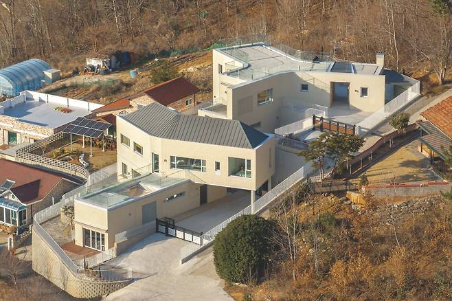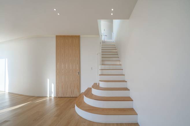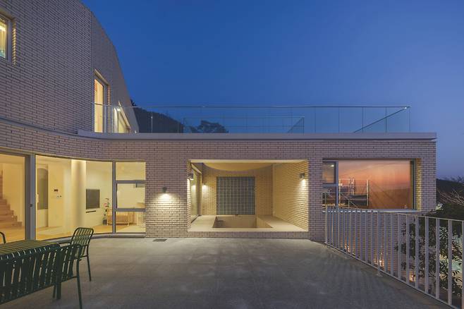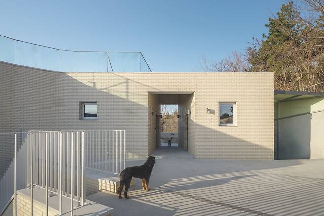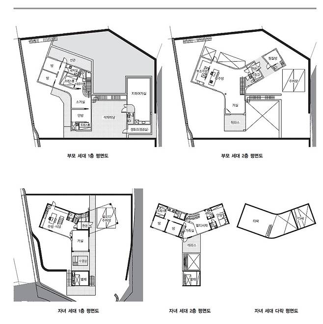 상부에 위치한 부모님 집은 지상 1층의 현관을 통해 진입할 수 있으며, 1층에는 거실과 주방이 배치됐다. 그러나 이 주택의 주요 생활공간은 지하 1층에 자리잡고 있다. 경사진 지형 덕분에 지하 1층이라 하더라도 충분한 채광과 개방감을 확보할 수 있었다. 지하 1층에는 안방과 게스트룸, 드레스룸 등이 배치됐으며, 바깥에는 별채가 이어진다. 이 별채는 아버지의 취미 공간으로 활용되는 등 집 안팎에서 다양한 활동이 가능하도록 계획됐다.