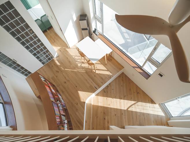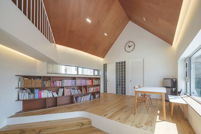 특히 2층은 부메랑 형태의 매스를 갖추고 있는데, 양 끝에 다락을 두고 중앙부의 천장을 높이는 방식으로 계획했다. 부메랑이 꺾이는 부분의 천장을 높여 독특한 공간감을 연출했고, 여기에 짙은 색의 목재 마감을 적용함으로써 보다 깊이 있는 분위기를 더했다. 이는 공간에 따뜻함을 부여하면서도 입체적인 미감을 형성하는 중요한 요소가 됐다.