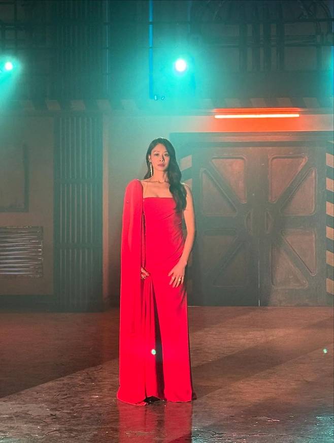 특히 드레스는 가볍게 주름진 시폰 소재로 어깨 라인을 자연스럽게 강조하며, 허리 라인에 은은하게 잡힌 셔링 디테일이 여성스러운 실루엣을 한층 돋보이게 했다. 피부 톤을 환하게 밝혀주는 선명한 레드 컬러는 장신영 특유의 고급스러운 이미지와 절묘하게 어우러지며 한층 매혹적인 인상을 남겼다.