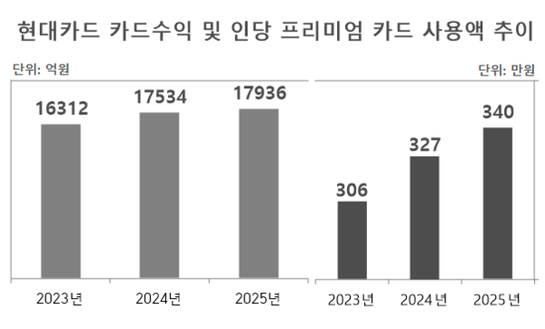 지난해 12월 기준 현대카드 프리미엄 카드의 1인당 이용액은 340만원으로 전년(327만원) 대비 4% 증가했다. 이는 회사의 신용판매 실적을 제고할 뿐 아니라 더 많은 연회비 수익을 거둬들이는 구조가 만들어졌다는 의미다. 지난해 현대카드의 카드수익은 1조8936억원으로 전년(1조7354억원) 대비 2.3% 증가했다.