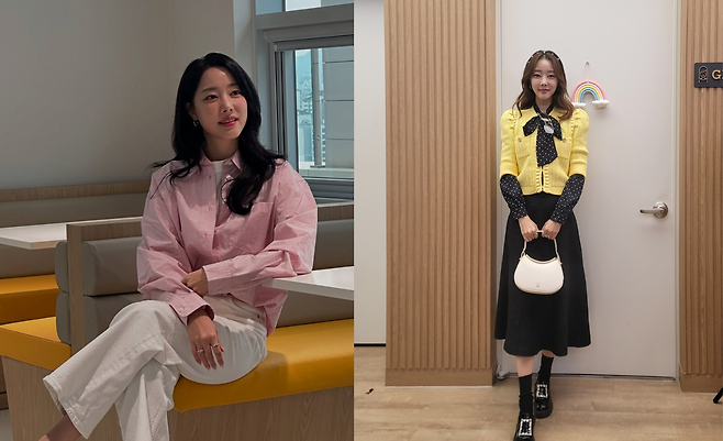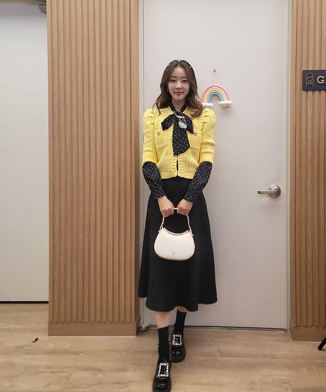 고우리는 옐로우 니트 가디건과 블랙 롱 스커트를 매치해 클래식하면서도 여성스러운 스타일을 완성했다. 니트의 리본 디테일과 도트 패턴이 포인트가 되어 단조로움을 피하고, 블랙 스커트는 차분함을 더한다. 여기에 화이트 핸드백과 로퍼를 더해 우아하면서도 단정한 분위기를 연출했다.