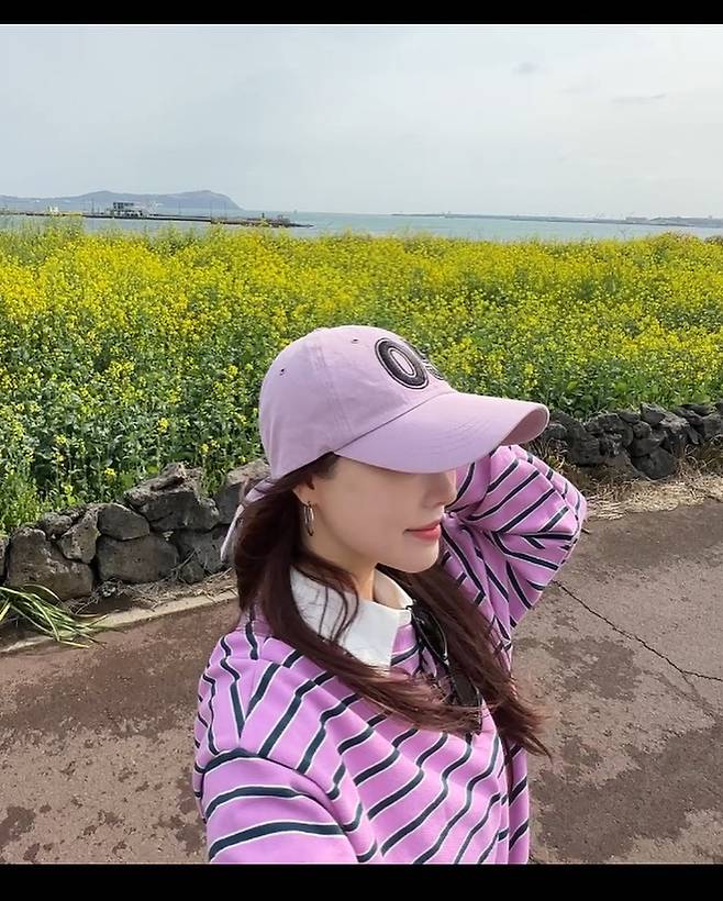 고우리는 보라색 스트라이프 티셔츠와 같은 톤의 캡 모자를 착용해 경쾌한 여행 룩을 선보였다. 스트라이프 패턴은 캐주얼하면서도 활동적인 이미지를 부각시키며, 보라색 계열의 통일감 있는 스타일링이 돋보인다. 배경의 유채꽃밭과 바다 풍경은 그녀의 자연스러운 매력을 더욱 빛나게 한다.
