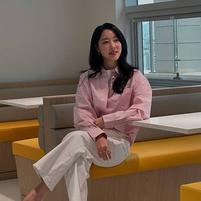 고우리는 핑크 셔츠와 화이트 팬츠를 매치하여 깔끔하면서도 세련된 캐주얼 룩을 완성했다. 핑크 셔츠는 은은한 색감으로 봄 시즌에 적합하며, 여유로운 핏이 편안함을 강조한다. 여기에 화이트 팬츠를 더해 전체적으로 밝고 산뜻한 분위기를 연출했다. 노란색 의자가 배경으로 자리 잡아 룩의 색감과 자연스럽게 어우러진다.