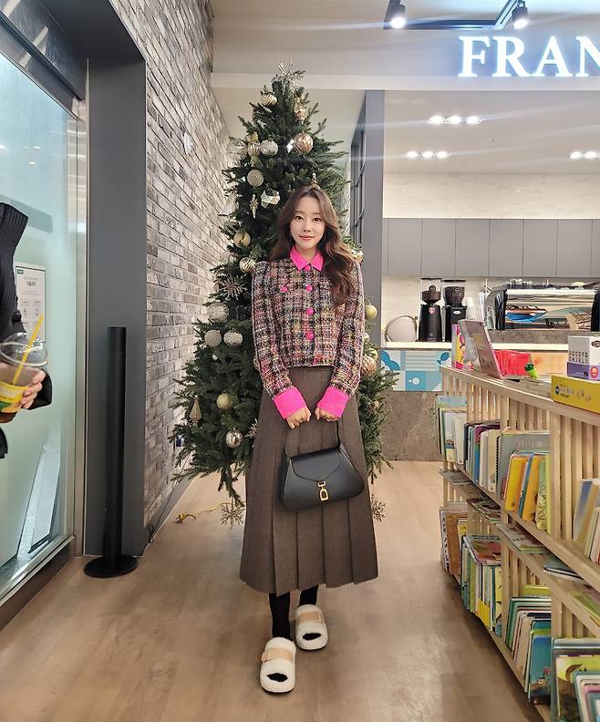고우리는 핑크 셔츠와 트위드 재킷, 브라운 플리츠 스커트를 조합해 고급스러운 겨울 패션을 선보였다. 트위드 재킷은 클래식한 멋을 더하며, 핑크 셔츠가 룩에 생기를 불어넣는다. 브라운 톤의 스커트는 차분함을 유지하면서도 전체적인 색감 조화를 이루고 있다. 화이트 퍼 슬리퍼를 착용해 독특하면서도 따뜻한 느낌을 강조했다.