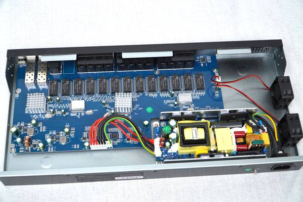 제품 외부의 나사를 풀어 하우징 상단을 들어내면 손쉽게 ipTIME PoE24004의 내부 모습을 확인할 수 있다.