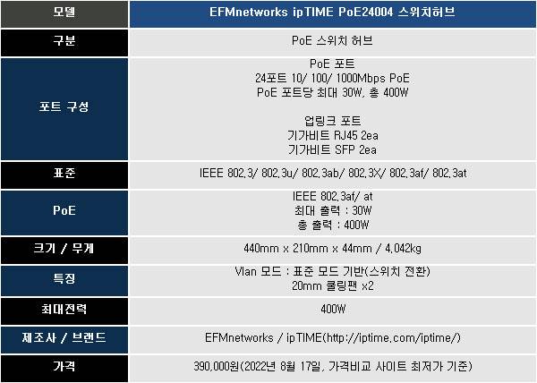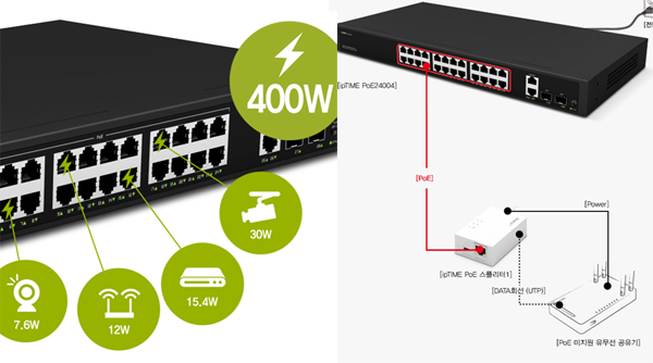 포트당 최대 30W, 총 400W 전력의 PoE 허브, ipTIME PoE24004