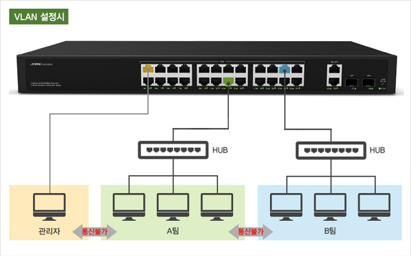 SFP 업링크로 100m 이상 거리, VLAN으로 독립된 네트워크 구성
