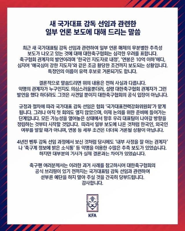 축구협회는 10일 공식 SNS(소셜네트워크서비스) 채널을 통해 "최근 새 국가대표팀 감독 선임과 관련해 일부 언론 매체의 무분별한 추측성 보도가 나오고 있는 것에 대해 대한축구협회는 심각한 우려를 표한다. 축구협회 관계자의 발언이라며 '한국인 지도자로 내정', '연봉은 10억 이하'에다, 심지어 '애국심이 강한 지도자'와 같은 조금 황당한 조건까지 보도되는 상황이다. 특정인의 이름이 유력 후보로 거론되기도 한다"고 밝혔다.