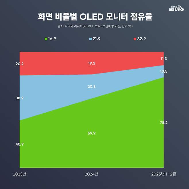 하지만 지난해부터는 LG 울트라기어 32GS95UE(32인치, 16:9, 실시간 1,699,480원), 델 에일리언웨어 AW2725DF(27인치, 16:9, 실시간 1,299,000원) 등 16:9 화면비 제품의 인기가 늘어나면서 변화가 생겼다. 그 결과 16:9 비율의 OLED 모니터 점유율이 2023년 40.9%에서 2025년 1~2월 78.2%로 크게 증가했다.