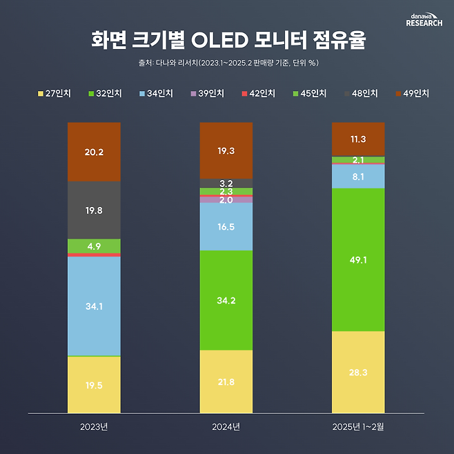 최근 OLED 모니터 시장에서는 대중적인 크기의 제품이 점점 더 많이 판매되는 추세다. 2023년에는 34인치와 48인치 등 대형 제품의 비중이 높았지만, 2024년부터는 32인치와 27인치 모델이 빠르게 성장했다. 특히 2025년 1~2월에는32인치(49.1%)와 27인치(28.3%)가 시장의 주류로 자리 잡으면서, 중형 사이즈 제품이 대세로 떠올랐다.