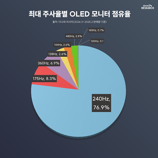 다나와 리서치 자료를 보면 OLED 모니터 시장에서 240Hz 제품이 76.9%의 점유율을 차지하며 주류로 자리 잡았다. 이는 OLED 패널을 사용하는 고급형 모니터에서 초고주사율이 기본적으로 적용되고 있음을 의미한다.