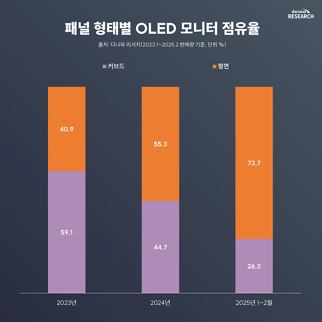 최근 OLED 모니터 시장에서 커브드 패널의 점유율이 감소하고 있다. 2023년에는 울트라와이드 OLED 모니터의 인기로 커브드 제품이 전체의 59.1%를 차지했으나, 2024년에는 44.7%, 2025년 1~2월에는 26.3%로 줄어들었다.