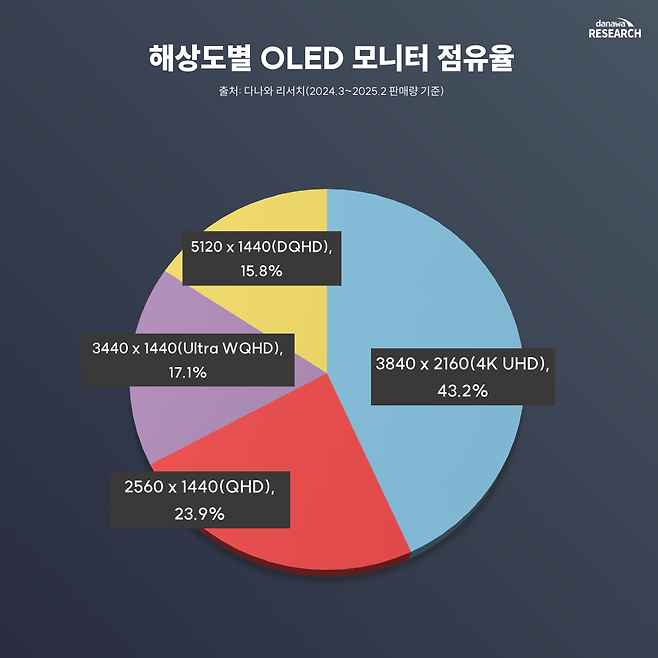 지난 1년 동안 다나와 리서치를 통해 판매 집계된 OLED 모니터의 해상도별 점유율을 보면, 4K UHD(3840×2160)가 43.2%로 가장 높은 비중을 차지했다. 이는 OLED 패널이 적용된 프리미엄 모니터들이 고해상도를 중심으로 출시되고 있음을 보여준다.