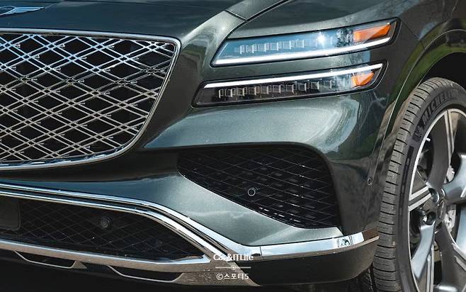 신형 GV80의 변화는 자세히 보지 않으면 쉽게 알아차리기 어렵습니다. 분할형 헤드라이트와 대형 오각형 그릴은 기존 모델과 유사하지만, 그릴 내부의 트윈 스포크 메쉬 디자인과 플래그십 세단인 G90에 적용된 마이크로 렌즈 어레이 헤드라이트가 눈에 띕니다. 또한, GV80의 전면부는 더 커진 공기 흡입구와 스키드 플레이트 덕분에 더욱 넓고 스포티한 인상을 줍니다.