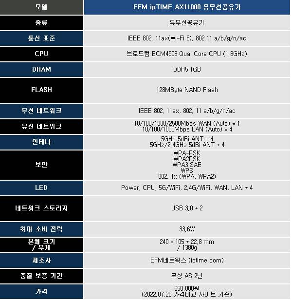 EFM ipTIME AX11000 유무선공유기(이하 ipTIME AX11000)는 8개의 안테나로 802.11ax(와이파이6)를 지원하는 AX11000급 트라이 밴드(TRI Band) 기가비트 와이파이 공유기다. 크기는 본체 기준 240 * 105 * 22.8mm에 무게 1380g으로 유무선공유기치고는 크고 무겁다. 측면은 하얀색, 상하면은 검은색에 통풍구를 마련한 ipTIME 특유의 디자인으로 설계되었다.