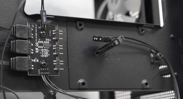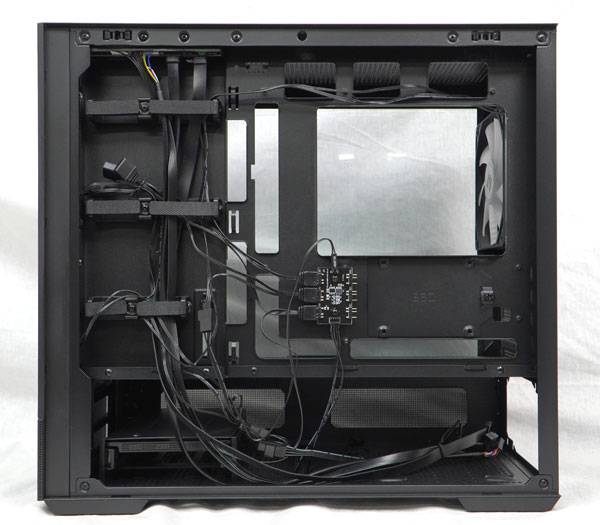 먼저, 메인보드 고정면에 1개의 2.5" HDD/ SSD 장착이 가능한 브라켓이 제공된다. 해당 위치에는 기본 제공되는 쿨링팬 3개를 포함해 총 여섯 개의 ARGB 제어를 지원하는 허브도 확인할 수 있다.