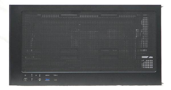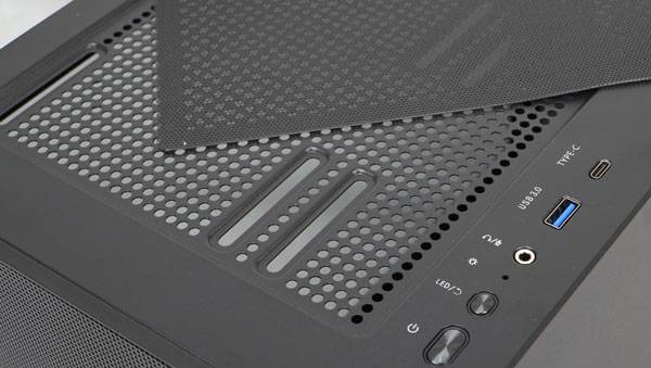 상단 우측면에는 전원 버튼/ 리셋 또는 ARGB 패턴 조절 버튼/ 전원 LED/ 오디오잭/ USB 3.0 Type-A 포트와 USB Type-C 포트가 배치되어 있다.