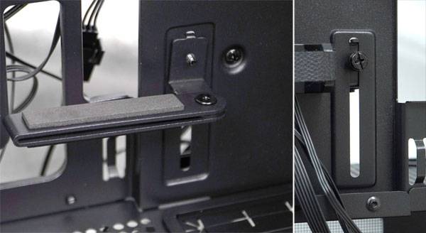 한편, 잘만 P30 AIR BTF 내부 듀얼 2.5" HDD / SSD 베이 하단에는 대형 그래픽 카드 무게로 인한 메인보드 슬롯 혹은 그래픽 카드 인터페이스 파손 방지를 위한 지지대가 기본 제공된다.
