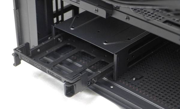 케이스 하단에는 3.5" 또는 2.5" HDD/ SSD 장착이 가능한 트레이와 프레임이 제공된다. 2개를 장착하기 위해서는 케이스 하단의 고정 나사를 풀고 프레임에 나사 고정한 후 다시 조립해야 해서 조금 번거롭긴 하지만, 가격대 용량비가 우수한 3.5" HDD가 필요한 사용자라면 충분히 감수할 수 있다. 하나만 사용할 때는 트레이를 이용해 손쉽게 장착할 수 있다.