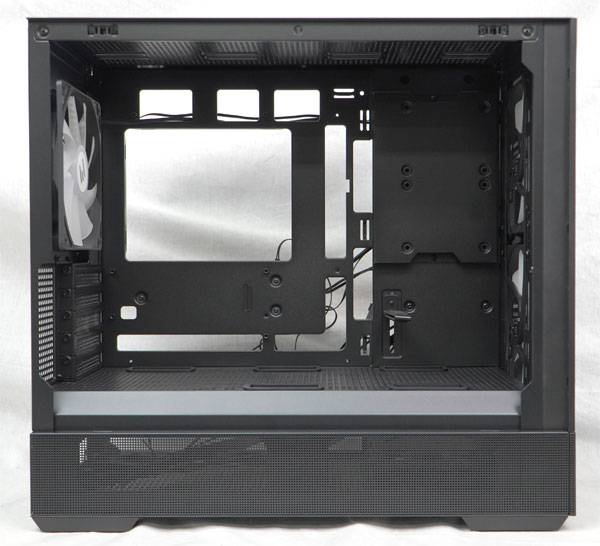 강화유리 패널쪽에서 보면 BTF 메인보드의 커넥터 노출을 위한 샤시 구조를 더욱 명확하게 확인할 수 있다. 잘만 P30 AIR BTF는 BTF 메인보드 대응 구조가 더해졌지만, 지금까지 규격의 메인보드와도 당연히 호환된다.