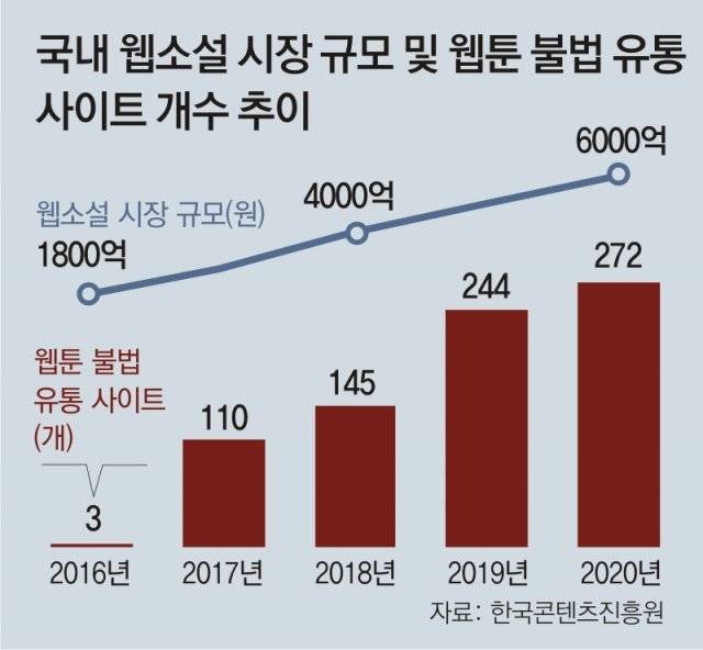 실제로 한국콘텐츠진흥원이 자체 파악한 불법 웹툰 공유 사이트는 2016년 3개 정도였지만 2020년 272개로 크게 늘어났다. 진흥원 관계자는 “2020년 기준 웹툰 시장은 1조538억 원 규모인데, 불법 사이트로 인한 피해가 5488억 원에 이를 만큼 심각하다”고 밝혔다.