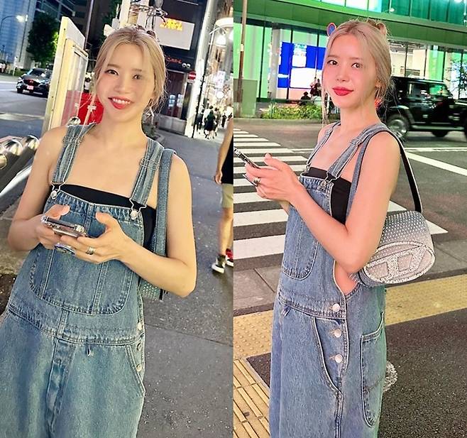 공개한 사진에서 솔라는 시원하게 쇄골 라인과 어깨가 드러난 블랙 튜브톱에 데님 멜빵바지의 오버롤 외출룩으로 도쿄 밤거리 산책을 나선 모습을 드러냈다.