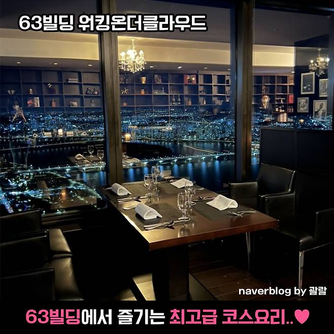 63빌딩 안에 위치하고 있는 레스토랑인 워킹온더클라우드! 이름과 명성에 걸맞게 서울 시내와 한강이 한 눈에 보여요. 고급스러운 분위기에서 즐기는 코스요리는 말해뭐해♥️