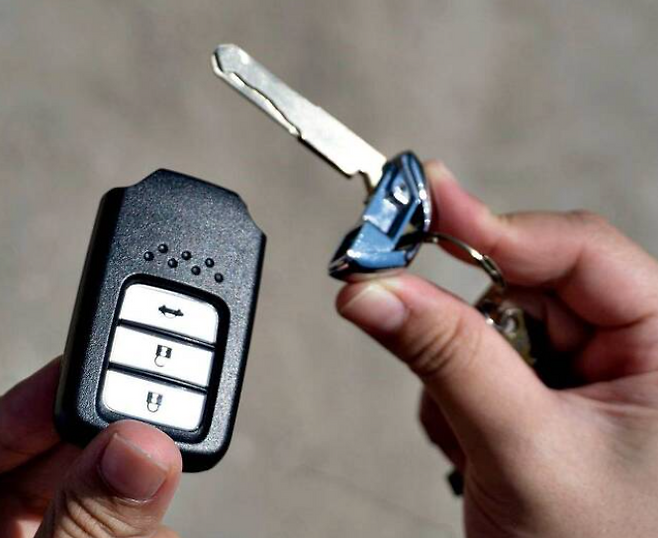 스마트키 내부에는 비상용 열쇠가 들어 있습니다. 열쇠를 꺼내는 방법은 제조사별로 다른데, 대부분 스마트키 위에 돌출된 작은 버튼을 눌러서 빼거나 당겨서 꺼냅니다.