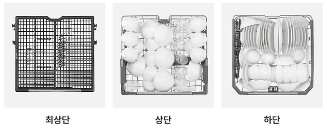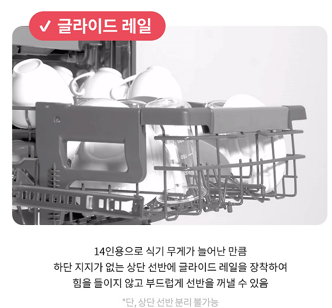 LG전자의 14인용 식기세척기는 3단 구조로 설계되어 있어서, 기본적인 12인용 모델보다 훨씬 더 넉넉한 수납 공간을 제공해요. 특히, 최상단에 다용도 렉이 추가되어 수저나 조리도구 등을 따로 정리할 수 있어 상단 바스켓에 머그컵이나 작은 그릇들을 여유롭게 배치할 수 있었죠. 이는 공간을 더욱 효율적으로 활용할 수 있게 도와주기 때문에 식기 수가 많을 수 있는 가구에서는 큰 장점이 되어요. 아직은 둘 뿐이지만, 저희는 요리를 많이 해먹는 편이었고 나중에 자녀가 태어날 경우도 고려해야 했어요.