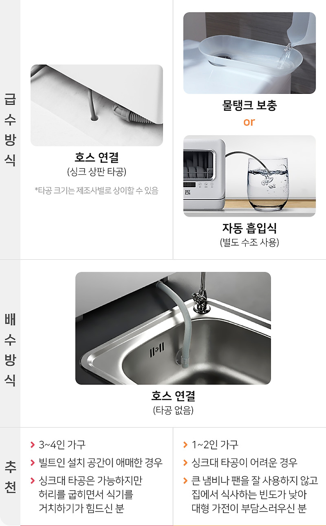 전용 물탱크에 물을 채워서 사용하는 제품이었어요. 수도 연결이 필요 없어서 어디든 둘 수 있고, 이사 갈 때도 부담이 없다는 게 장점이었죠. 하지만 계속 물을 채워야 한다는 점이 귀찮을 것 같았어요. "설거지 줄이자고 산 건데, 결국 내가 물통 채우느라 왔다 갔다 하는 거 아냐?"라는 생각이 들었어요.