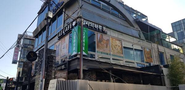 상처를 받아온 유기묘들에게 사랑을 불어주는 이곳은 집사의 하루라는 고양이카페인데요. 홍대 메인 길에서 홍익문화공원옆에 자리를 하고 있는 대형 고양이카페입니다.