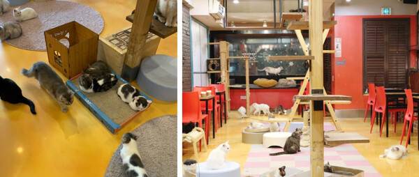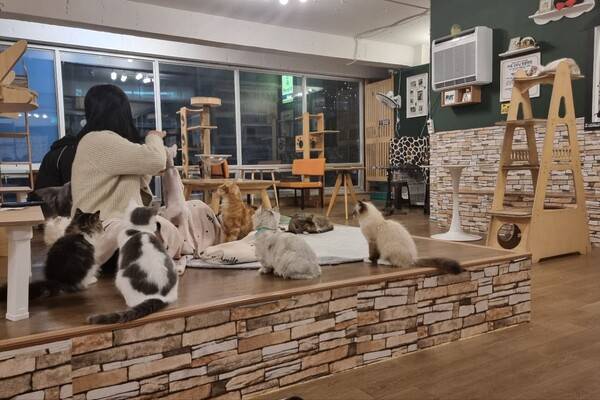 고양이카페에 들어가게 되면 수십 마리의 고양이들이 자유롭게 생활을 즐기고 있는데요. 성묘부터 아기고양이까지 모두 사람들을 잘 따르는 일명 개냥이의 모습을 보여줍니다.