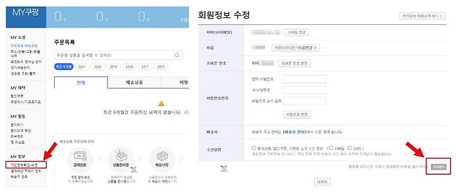 쿠팡 앱에서 계정을 탈퇴하려면 <마이쿠팡>의 <회원정보 수정>을 누른 뒤 으로 이동해야 합니다.