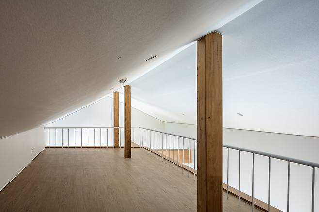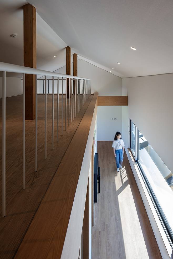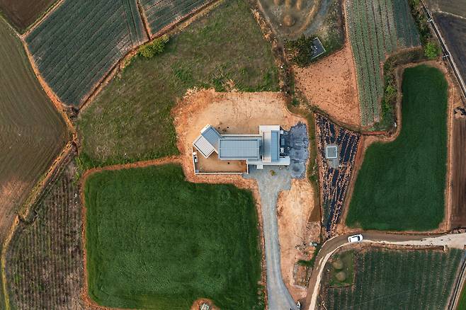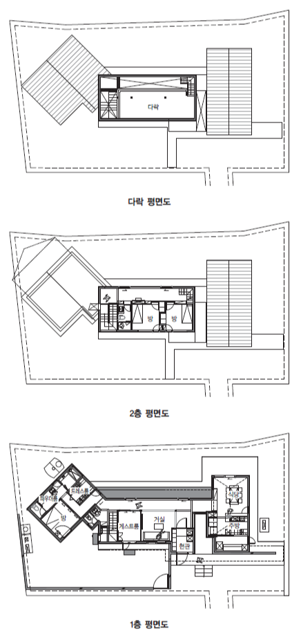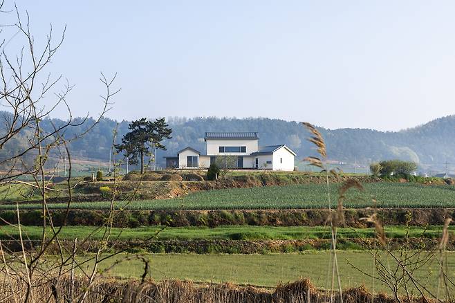 주변에 이웃한 집이 없었기에 넓게 밭으로 펼쳐진 둥근 언덕배기 대지에 도심 속 집처럼 우뚝 솟은 건물보다는 나지막하게 땅에 붙어 여러 개의 채가 자연스럽게 툭툭 놓인 모습을 그렸다. 그렇게 집은 크게 3채로 나뉘게 됐다. 현관과 손님방이 있는 거실채, 식당이 있는 주방채, 현관으로부터 가장 안쪽에 있는 안방채. 그중 아이들 방은 거실채 위로 올려 집의 중심을 잡았다. 처음에 그린 모습은 단층이었지만 건폐율의 제약과 2층 다락방을 꿈꾸는 아이들을 위해 중간 거실채는 두 개 층이 됐다.