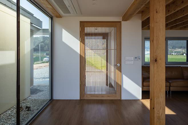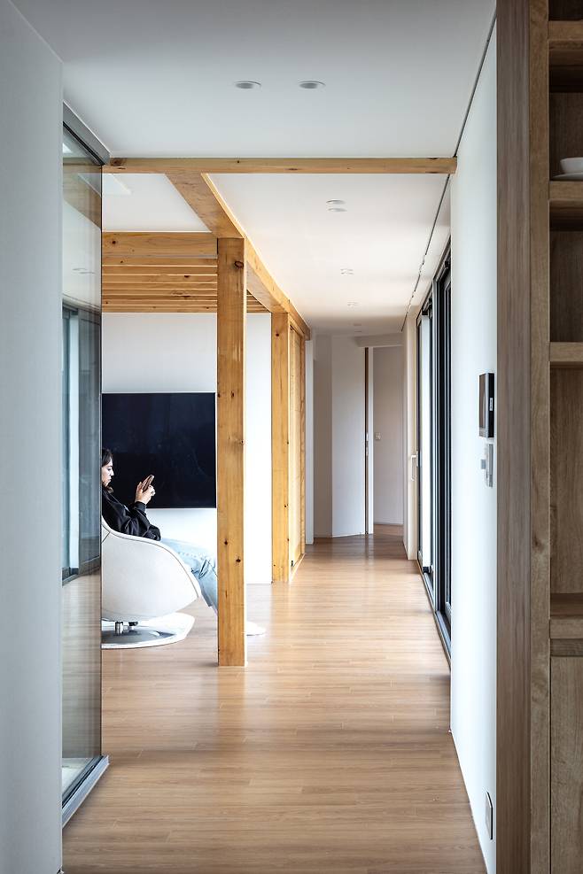 코로나 사태 이후 급격하게 오른 공사비로 인해 집의 구조는 비교적 저렴한 경량 목구조로 결정됐다. 기둥과 보의 시공 방식인 중목구조와 다르게 경량 목구조는 벽식 구조라 목구조체가 석고보드 벽체에 가려지므로 실내에서 이를 시각적으로 즐길 수가 없다. 이를 보완하고자 기본 구조는 벽식 경량 목구조로 채택하되 각각의 채마다 적절하게 기둥과 보를 섞어 쓰는 구조로 변형해 실내에서도 목구조체를 시각적으로 즐길 수 있도록 계획했다. 언뜻 보면 마치 중목구조와 같아 보인다.