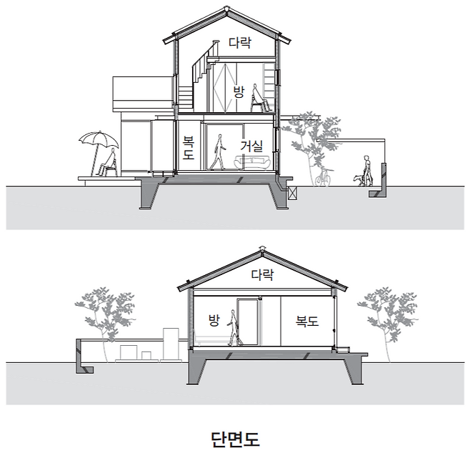 벌레가 많은 시골집 특성을 고려해 기단은 콘크리트 매트기초 지중보 구조로 하고 지붕보 길이를 조절해 땅에서 60cm 이상 띄웠다. 이 기단은 외벽에서 적게는 60cm, 많게는 2m까지 연장해 뒷마당의 툇마루가 되기도 하고 식당 앞의 외부 테라스가 되기도 한다. 기단 일부는 건물 1층 벽 높이까지 올려 현관이 있는 앞마당의 담장이 되고 일부는 뒷마당의 낮은 담장이 되기도 한다.