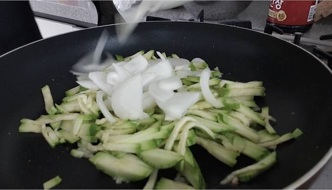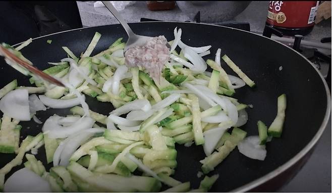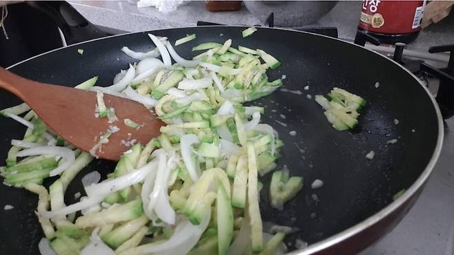 애호박과 양파를 넣고 뒤적뒤적 볶아주세요