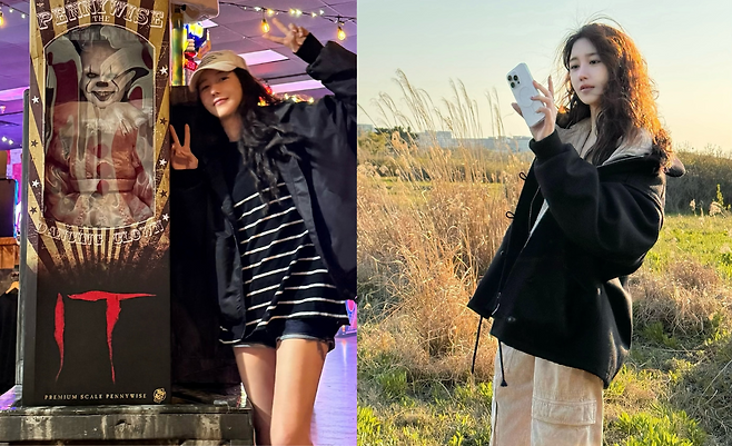 할로윈 시즌을 맞아 페니와이즈 인형과 함께 포즈를 취한 이지아의 모습이 눈길을 끈다. 블랙 재킷과 스트라이프 티셔츠, 데님 쇼츠를 레이어드한 스타일링은 경쾌하면서도 시크한 분위기를 자아낸다. 베이지 컬러 캡 모자와 함께 연출한 이 룩은 할로윈 특유의 유쾌한 분위기를 트렌디하게 해석해냈다.